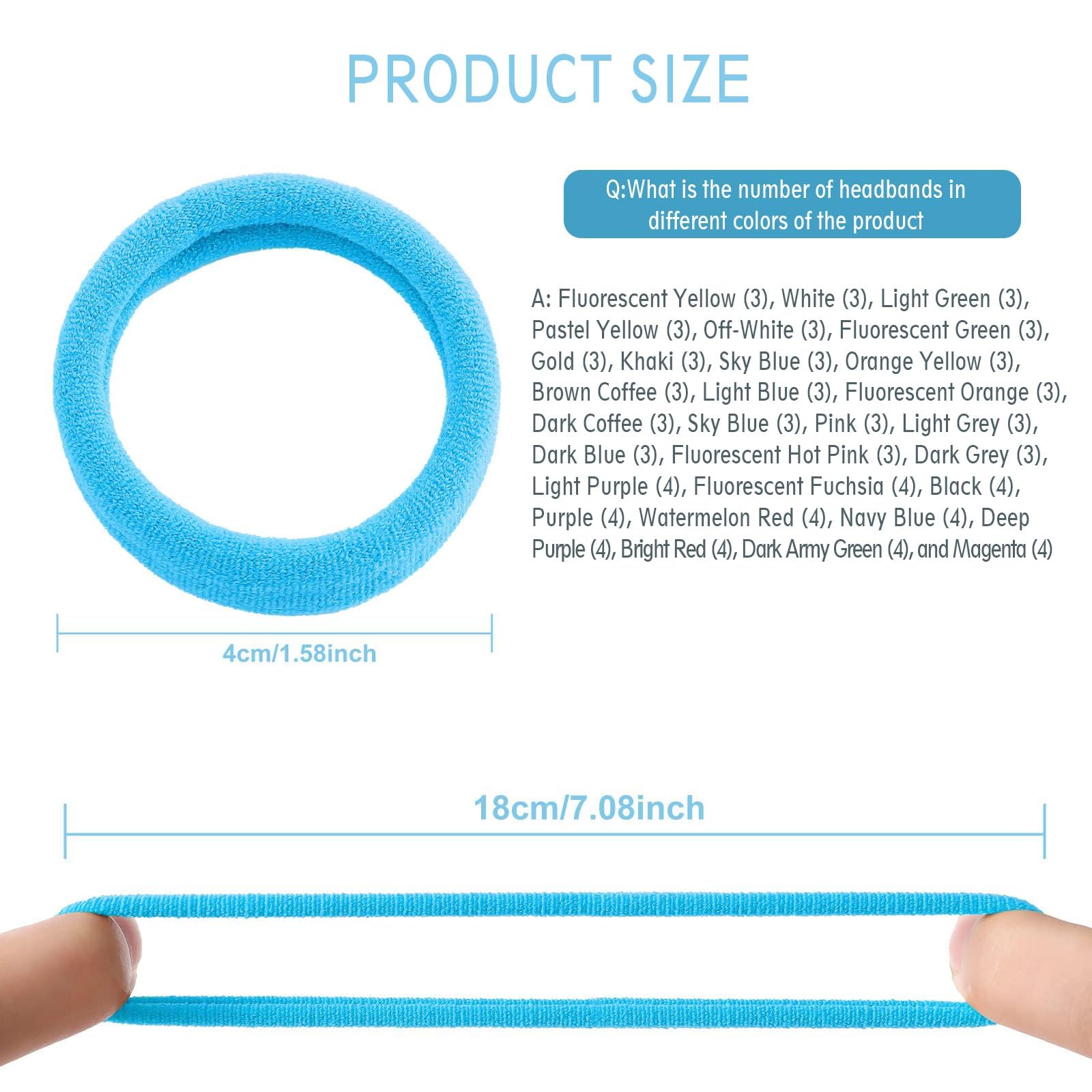 - Hairbands details: Fluorescent Yellow, White, Light Green, Pastel Yellow, Off-White, Fluorescent Green, Gold, Khaki, Sky Blue, Orange Yellow, Brown Coffee, Light Blue, Fluorescent Orange, Dark Coffee, Pink, Light Grey, Dark Blue, Fluorescent Hot Pink, Dark Grey (each in sets of 3). Light Purple, Fluorescent Fuchsia, Black, Purple, Watermelon Red, Navy Blue, Deep Purple, Bright Red, Dark Army Green, Magenta (each in sets of 4).