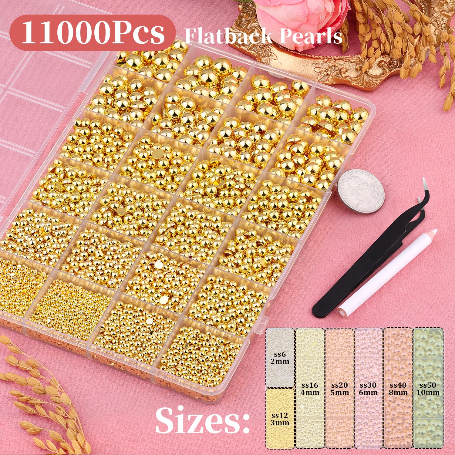 - 💎PACKAGE CONTENT -- The package includes 1 box with 24 grids, featuring a variety of sizes: 2mm x 2 grid, 3mm x 2 grid, 4mm x 4 grids, 5mm x 4 grids, 6mm x 4 grids, 8mm x 4 grids, 10mm x 4 grids, approx. 11000 pcs of 2-10mm bling-out pearls (Gold). 1 tweezers and 1 pickup pen are included for easily picking up of these craft beads. 3 B7000 adhesive jewels glue for jewelry making. The large amount will support you to fulfill a number of your wonderful DIY decoration ideas.