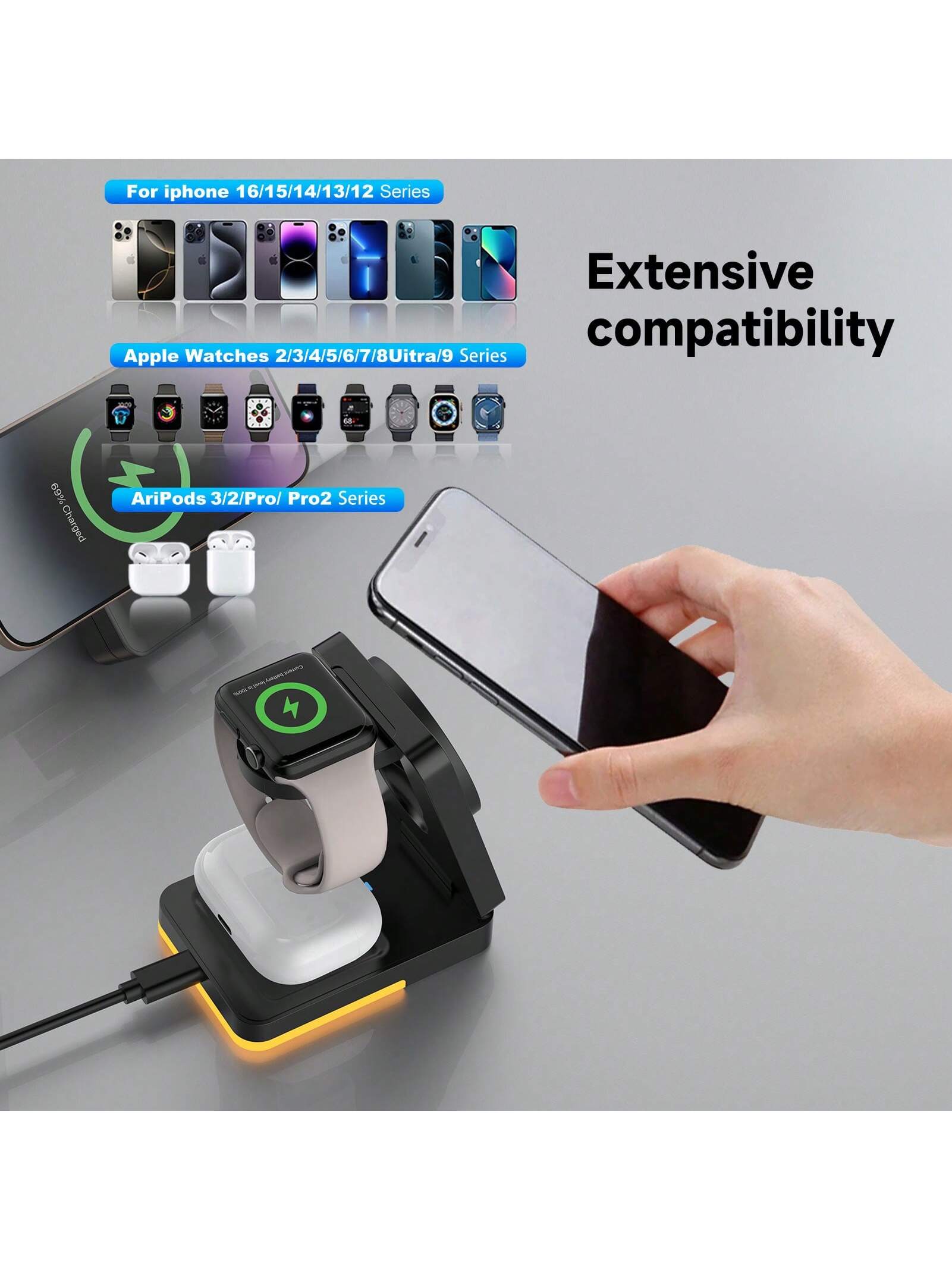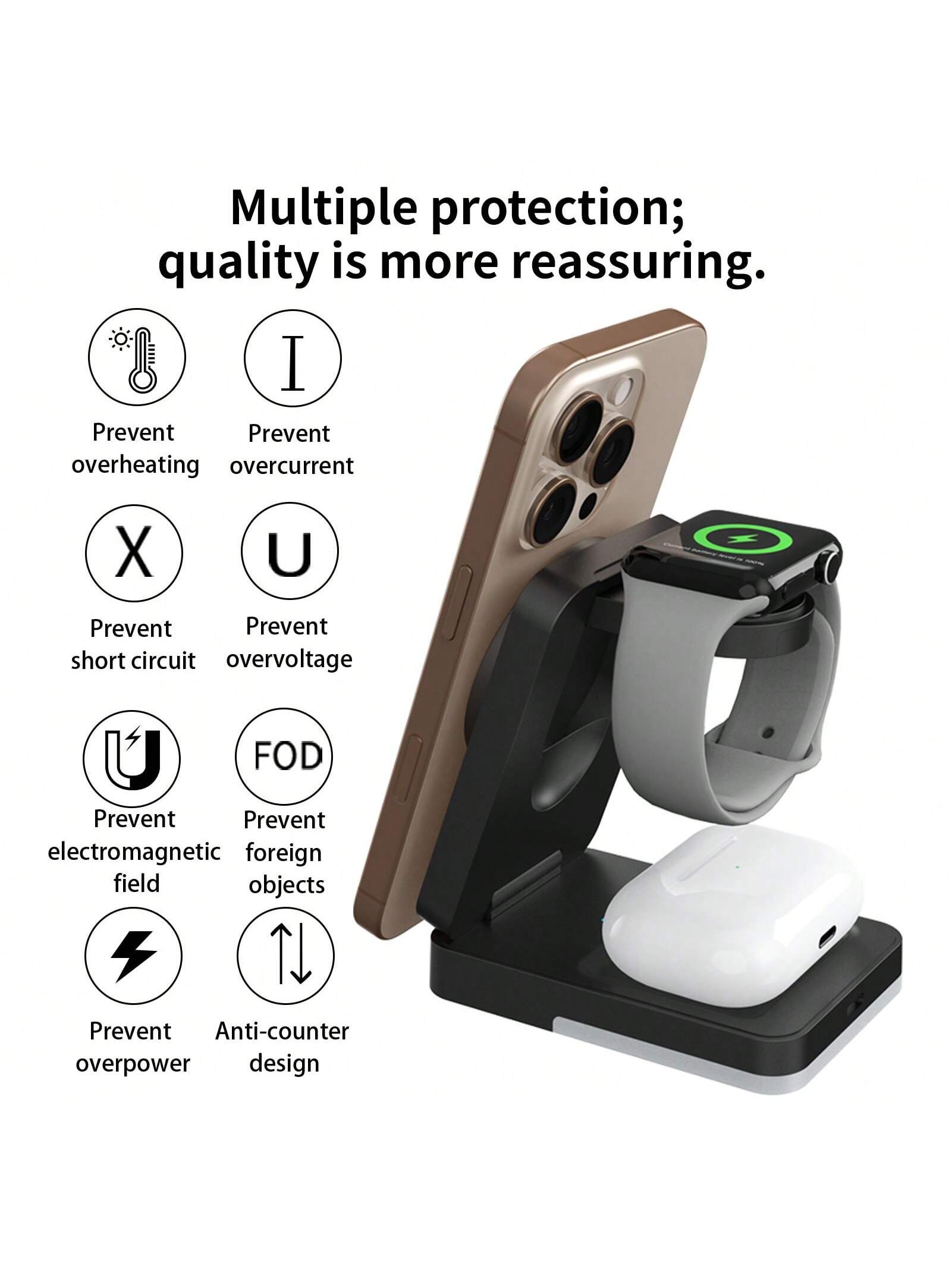 This 3-in-1 15W Fast Wireless Charging Station efficiently powers your iPhone, Apple Watch, and earbuds simultaneously. Designed for expert convenience, it delivers optimized charging speeds up to 15W for your iPhone while securely supporting your watch and earbuds. Its compact, integrated design reduces cable clutter, making it ideal for desks or nightstands. Compatible with Qi-enabled devices, this station ensures reliable, fast charging across all three devices for seamless daily use.