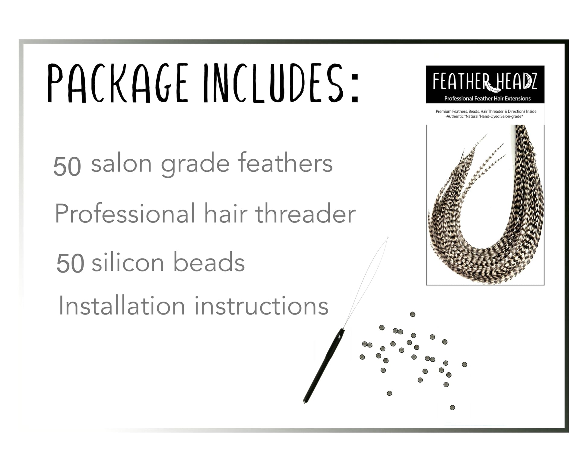 50 Grizzly Color Hair Feathers - 9”- 14” Long - Feathers for Hair Extension, Hair Extension DIY Kit - Eye-Catching Design - 50 Micro-link Beads - 100% Real Rooster Feathers