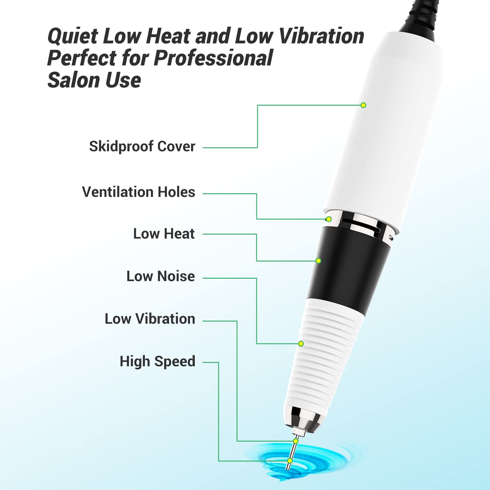 - Safe and Durable: The nail drill offers you optimum comfort and prevent heat and stress as it causes low vibration, low noise, low heat with unique silicone insulation and ample ventilation holes design for the handpiece