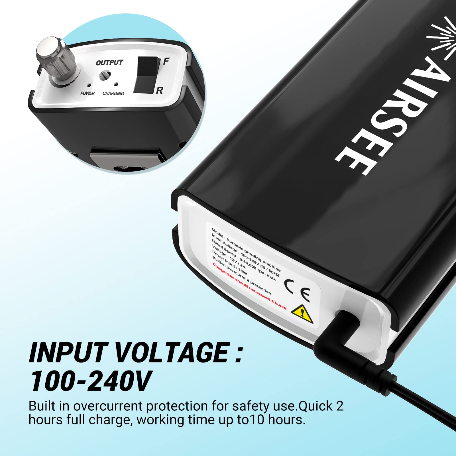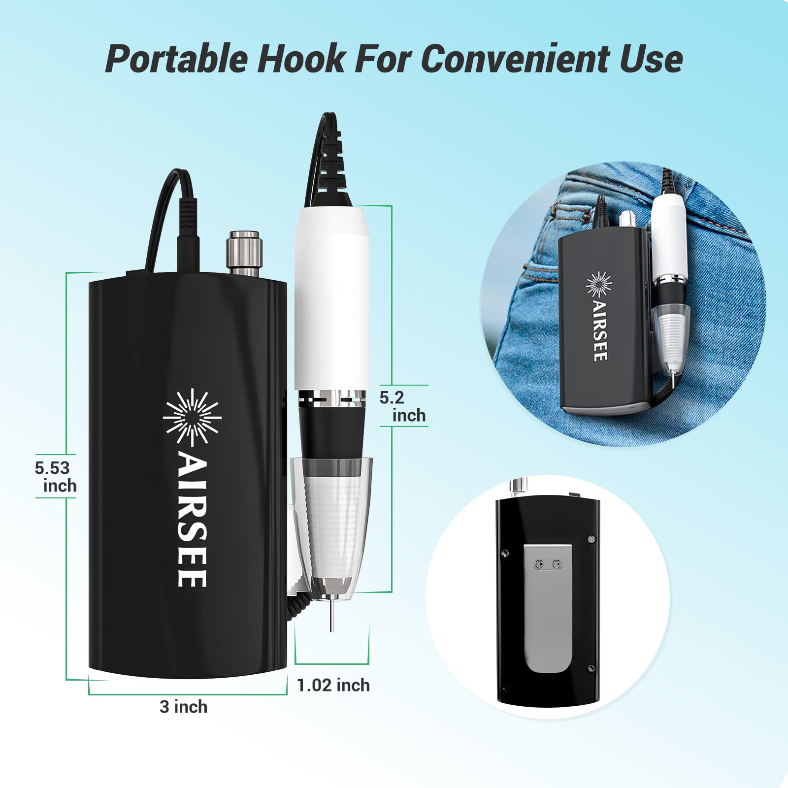 - Rechargeable and Cordless: In just 2 hours, you can fully recharge this AIRSEE portable nail drill. Then you can operate it continuously up to 6-10 hours. The cordless, lightweight design with portable hook make it easy to be carried anytime, anywhere
