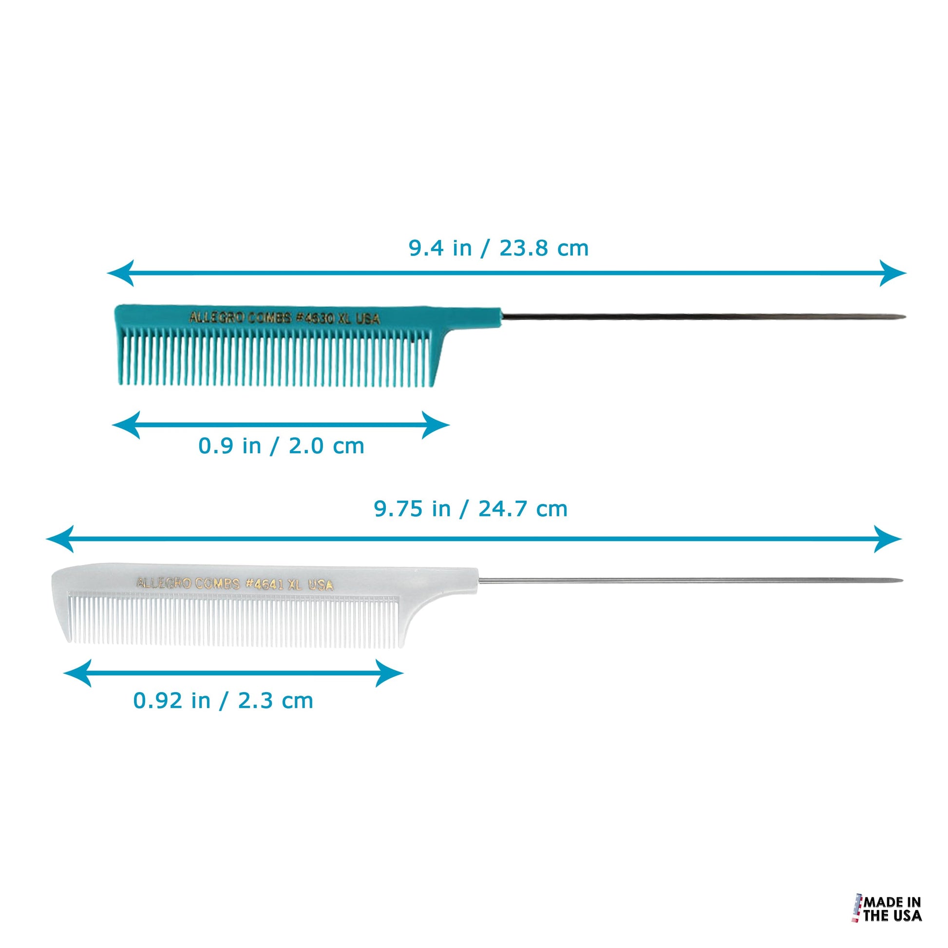 • EXTRA LONG PINS XL METAL PIN COMBS STAINLESS STEEL - Long tail foiling combs with rounded metal tip to easily part your hair. Two long tail foiling comb with different teeth types on each comb. Made in the USA. Hair foils combs. Extra long metal pins enables perfect foils. Dimension of the longest : L 9.75 x W 0.92 x 0.21 inches and of shorter comb: L 9.4 x 0.9 x 0.19 inches. These combs are perfect to be used with the longest aluminum foil sheets.