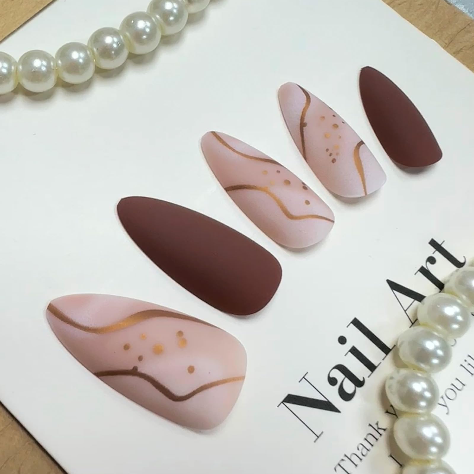Almond Press on Nails Medium Fake Nails with Designs Brown False Nails Press ons Gold Line Acrylic Glue on Nails Matte Full Cover Cute Artificial Stick on Nails for Women Nails Decorations 24Pcs