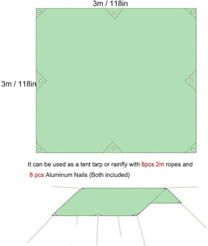 - Included Components : 1 fly tarp, 8 nylon ropes, 8 aluminum stakes, 1 carrying bag