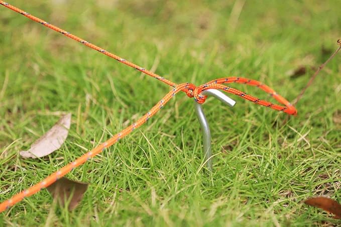 - 8 Nylon Ropes with adjusters,8 Aluminum Stakes and a dark green carrying bag.