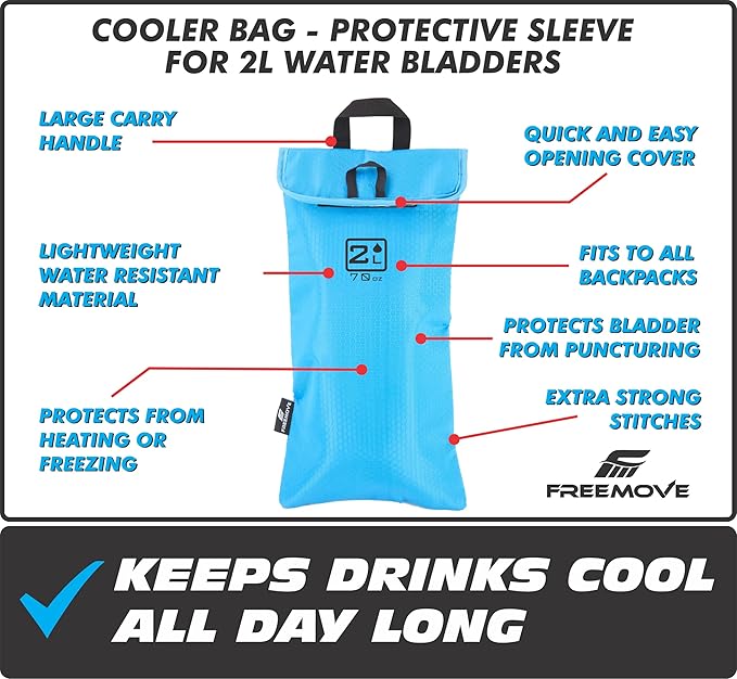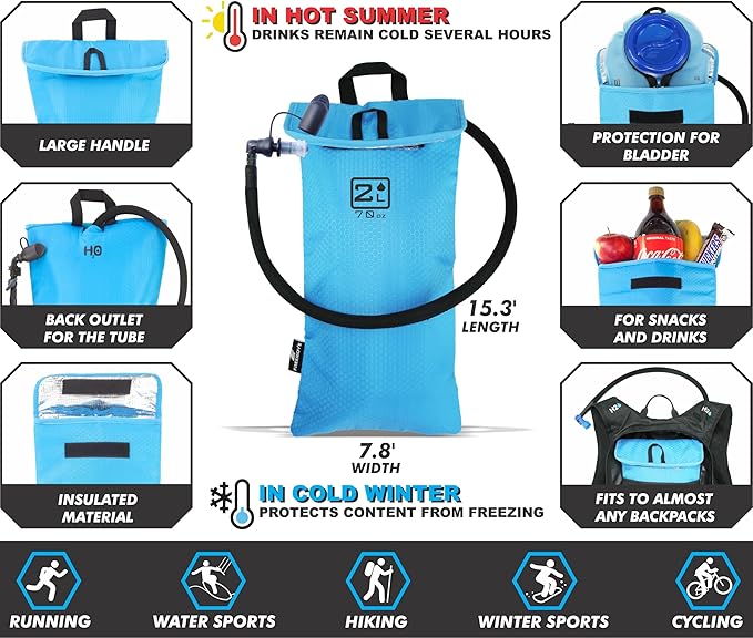- Top Notch Hydration Bladder Insulated Sleeve, Exactly What You Been Looking for If You Needed Something to Keep Your 2 Liter Hydration Bladder in Place and Also Cool, It Holds 2 Liter Water Bladder Perfectly By Protecting It Against Any Damage, Thermo Insulated Layer Will Keep the Water Inside the Bladder Cool for Many Hours, Perfect for Backpacking, Hiking, Camping, Marathon, Kayaking, Biking, Mtb, Trekking