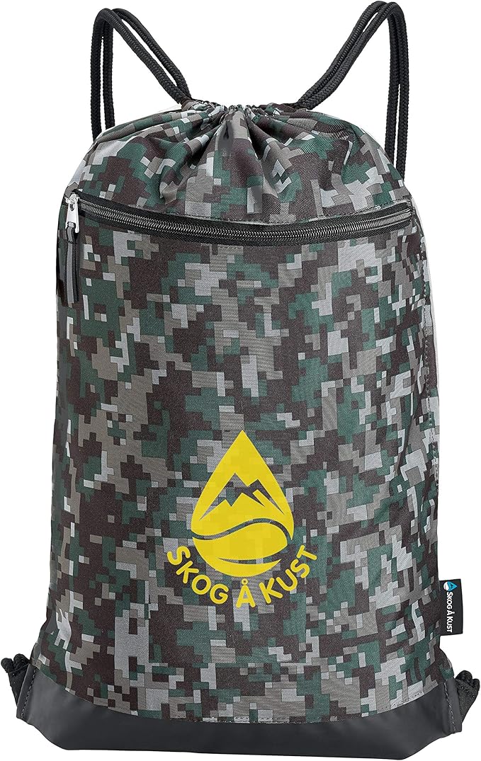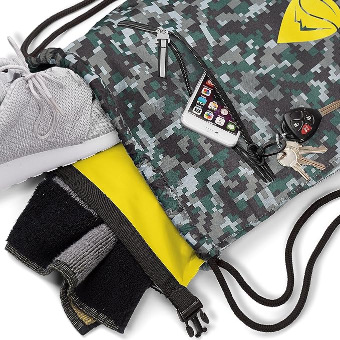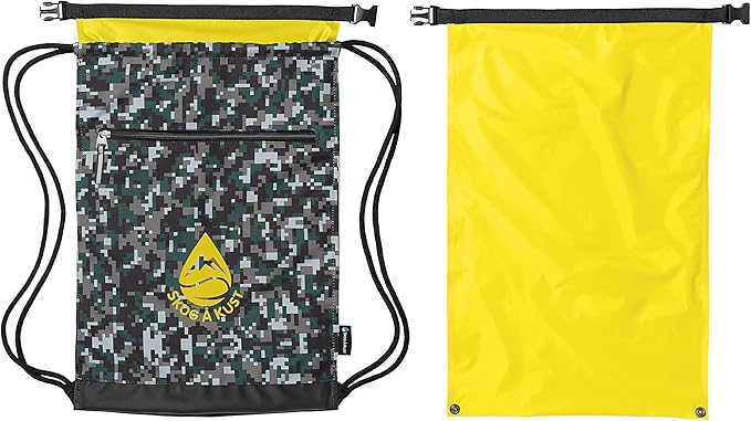 Skog Å Kust GymSak | Patented 2-in-1 Drawstring Cinch Bag with Removable Waterproof Dry Bag | Camo & Yellow