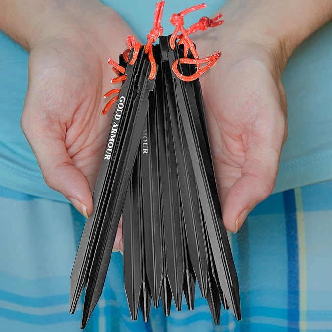 Gold Armour Tent Stakes - 12 Pack Heavy Duty, Lightweight, Camping Stakes Pegs for Outdoor Tent and Tarp, Essential Camping Gear Equipment Accessories (Black)