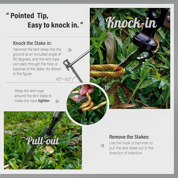 - Include 6-pcs Tent Stakes and 1 Stake Buckle -- 11 Inch Wind Resistant Length, 2.5 ounce Lightweight Tent Stakes, camping essentials for tent camper.