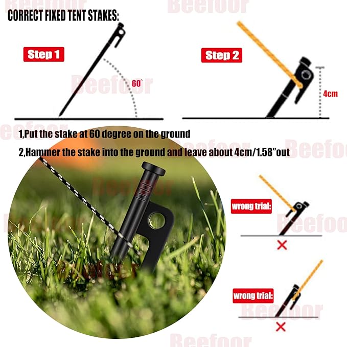 - ▶Tips for better use: - Please do not nail the tent stake vertically to the ground. - Make the tent stake and the ground into a 60-degree angle. - Please leave about 1.6 inches (4cm) of the tent stake on the ground to have enough room to tight the rope. - Use the hook to tight the rope. - Use the hole to pull out the tent stake.