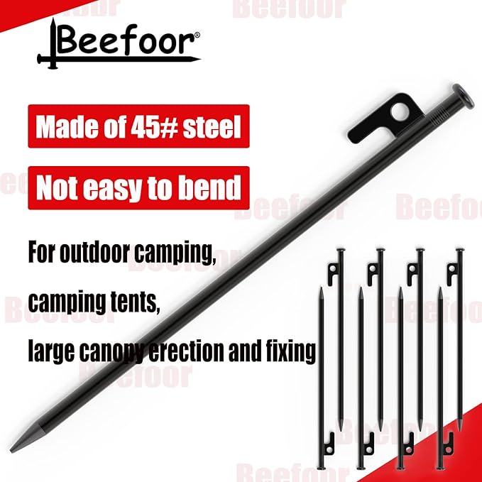 - ▶STURDY MATERIAL: Made of 45# steel, the surface is electrophoretic black, not easy to bend, and cost-effective. For outdoor camping, camping tents, large canopy erection and fixing. Long and heavy enough to stand against the wind.
