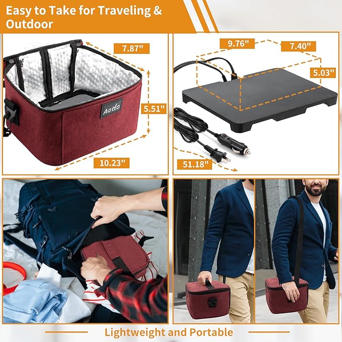 - β NO COMPATIBILITY WORRIES: Our portable lunch box warmer is compatible with reheatable flat bottom containers like glass, foil, metal or stainless steel, ceramic, and cardboard. Accommodate with larger containers up to 9.76' L x 7.01' W x 3.94β H, 1.8 quarts of food. Aotto heating lunch box car food warmer packaging is included a lunch bag, heating plate, and 2 power cords.