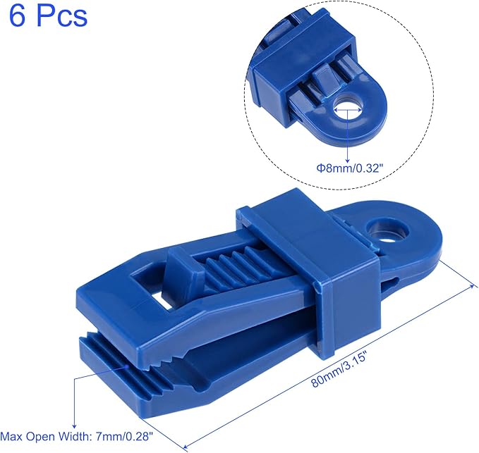 - PACKAGE INCLUDE: 6 Pack of Blue Tarp Clips, which overall size is 80mm x 30mm x 25mm / 3.15 x 1.18 x 0.98 inch (L*W*H), hole dia is 8mm / 0.32 inch, max open width is 7mm / 0.28 inch.