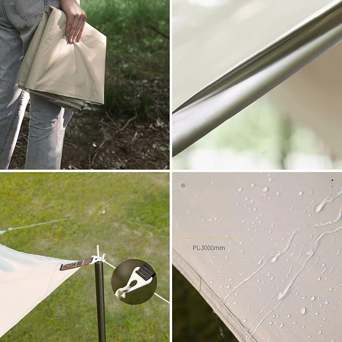 - WATERPROOF : Puraville camping tarp rain fly is made of super solid 210D rip-stop polyester, combined with PU 3000mm waterproof coating and leakproof-taped seams technology, which could effectively protect your camping gears from rainy or snow days. Fixed with six wind-resistant steel stakes, you can set up a safe campsite in minutes without need to worry its security.