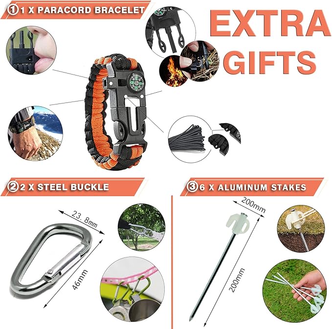 - Included Components : 1 x Paracord Compass Bracelet, 2 x Carabiners Clip, 1 x Camping Tarp, 1 x Portable Bag, 6 x Guylines with Adjuster, 6 x Aluminum Stakes1 x Paracord Compass Bracelet, 2 x Carabiners Clip, 1 x Camping Tarp, 1 x Portable Bag, 6 x Guylines with Adjuster, 6 x Aluminum Stakes
