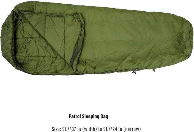 - Patrol/Recon sleeping bag using Nylon Ripstop and High-grade military filling material,high fluffy,compression resistant. Double-sided heavy-duty YKK zipper is strong and durable.Heat-treated seams ensure water and moisture resistance.Head Velcro for easy opening and closing of the top cover. The comfortable temperature is recommended to be 5-15 degrees;extremely low temperature -1 degree. Size: from 91.7x37inch (width) to 91.7x24inch (narrow)