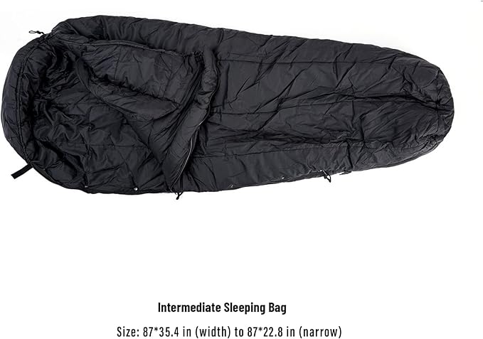 - MT Military Army Modular Sleeping Bag System(4-Piece) Assembly Includes Patrol Sleeping Bag, Intermediate Sleeping Bag, Bivy Cover and Stuff Sack. Mummy Style. A variety of combinations to meet the survival environment from 30 degrees above zero to 40 degrees below zero. It is made of Water-resistant and scratch-resistant high-strength nylon surface, thickened nylon tightening belt. Filling: Polarauard HV High-grade military filling material, high fluffy, compression resistant.
