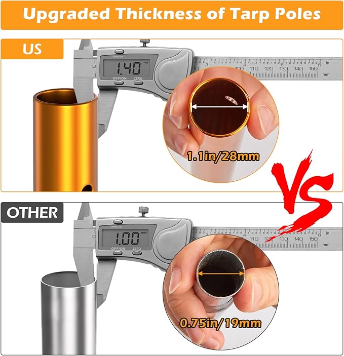 - UPGRADED TENT POLES: Our tent pole turns out to be more stabilized and more strengthening after upgrade. The diameter is 1.1 inches/28mm and the size of thickness is 0.06 inches/1.40mm. There are eight sections of tarp poles in the package. You can combine them into two separate long tarp poles. The length of each long pole reaches up to 97.2 inches. You adjust the length to meet your own requirements.