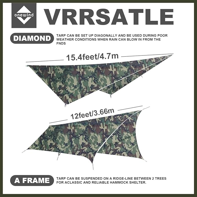 - ULTIMATE HYBRID TARP. Whether you need a home for your backcountry campsite or a place to stash your camping gears from prying eyes, a camouflage tarp is a lifesaver. Our Onewind Camouflage Tarp features a woodland camo design that is the perfect tarping solution in the bush or in the wild. It helps you build different kinds of emergency shelters that blends well into the surrounding landscape.
