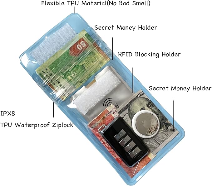 - 6. Large Compacity: the small dry bag can hold keys, coins, cards, money, ID, vaccine card, badge, fishing license, hunting License, driver license, Airtags and other small valuable items. For car transponder Key or Door key, Please put it into the RFID Blocking holder first before putting into the bag.