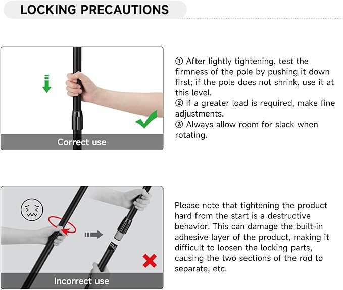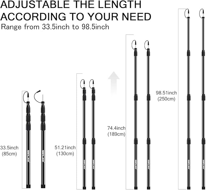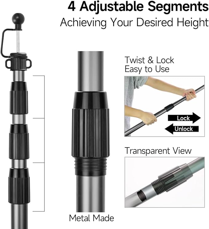 - Telescopic Design - Each pole consists of 4 segments with a convenient twist & lock mechanism, allowing easy extension from 2.8ft to 8.2ft.