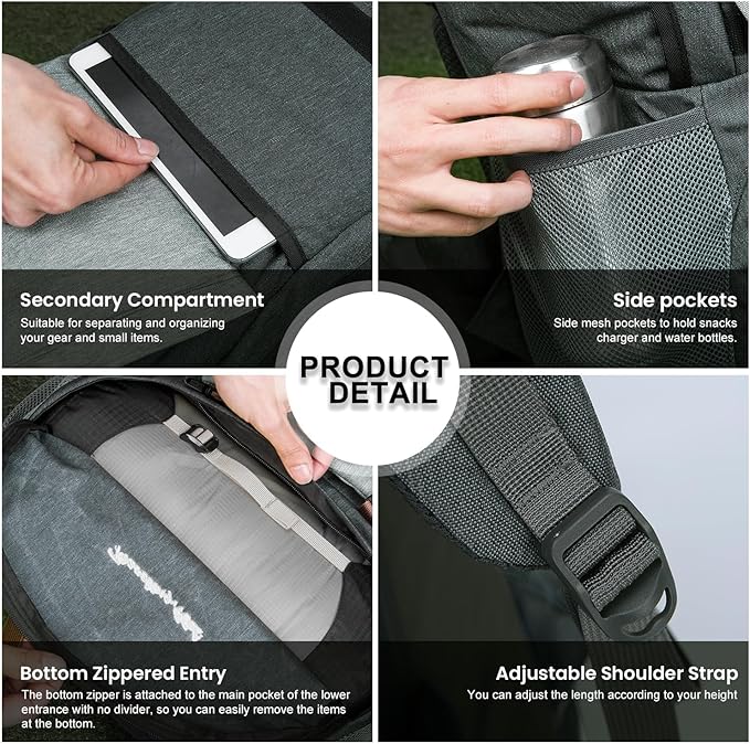 - Well-designed details: This outdoor backpack has many clever and convenient designs. The bottom compartment provides direct access to the main compartment; there is also a dedicated compartment for a water bladder (WATER BLADDER NOT INCLUDED), In addition, various shrink straps can also carry camping equipment such as trekking poles, sleeping bags and tents.