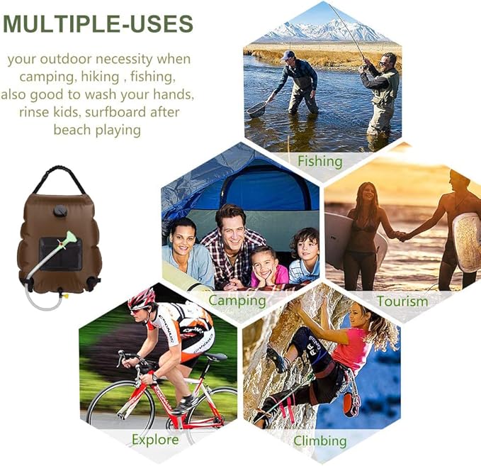 - 【High Water Capacity】This camping shower bag can carry up to 5 gallons/20L water for showering outdoor, let you enjoy a better and refreshing shower anywhere. In addition, our portable shower bag is so compact and lightweight that you can carry it in luggage, backpack or car trunk conveniently.