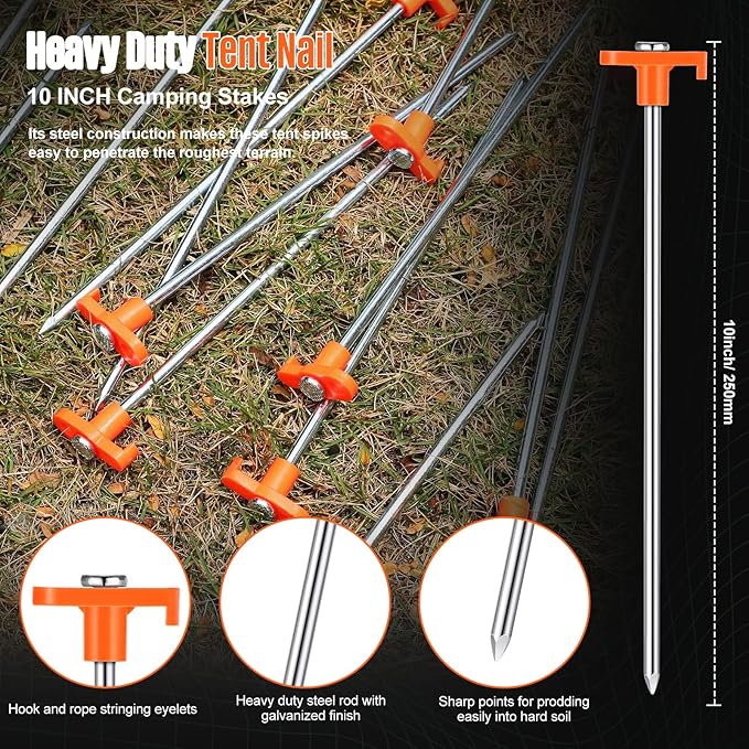 Shimeyao 10 Inch Tent Stakes Heavy Duty Camping Stakes Bulk Galvanized Non Rust Tent Pegs Metal Camping Spikes for Outdoor Camping Pitching Canopy
