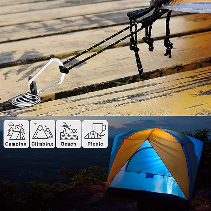 - [Easy installation] D-shaped carabiner is attached, which is convenient for you to fix the tent on the octopus deck nails. The installation method is very simple. Just insert it into the gap and rotate it to fix it. Binding with D-shaped carabiner and tent rope