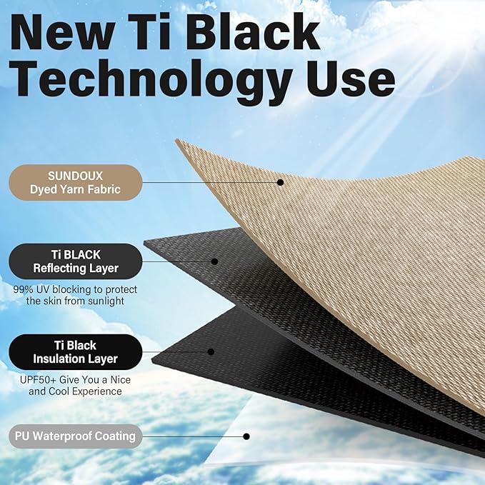 - Advanced Sunshine Protection: Safeguard yourself and your loved ones from the sun's harmful rays. Crafted with cutting-edge Titanium Black Glue UPF12500+, our waterproof camping tarp effectively blocks outdoor ultraviolet rays, reducing sunshine damage to your skin. The built-in heat insulation layer absorbs warmth, maintaining a pleasant temperature under the tarp.
