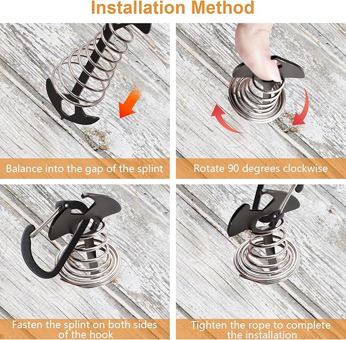 - π[Easy installation]: D-shaped carabiner is attached, which is convenient for you to fix the tent on the fish bone deck nails. The installation method is very simple. Just insert it into the gap and rotate it to fix it. Binding with D-shaped carabiner and tent rope.