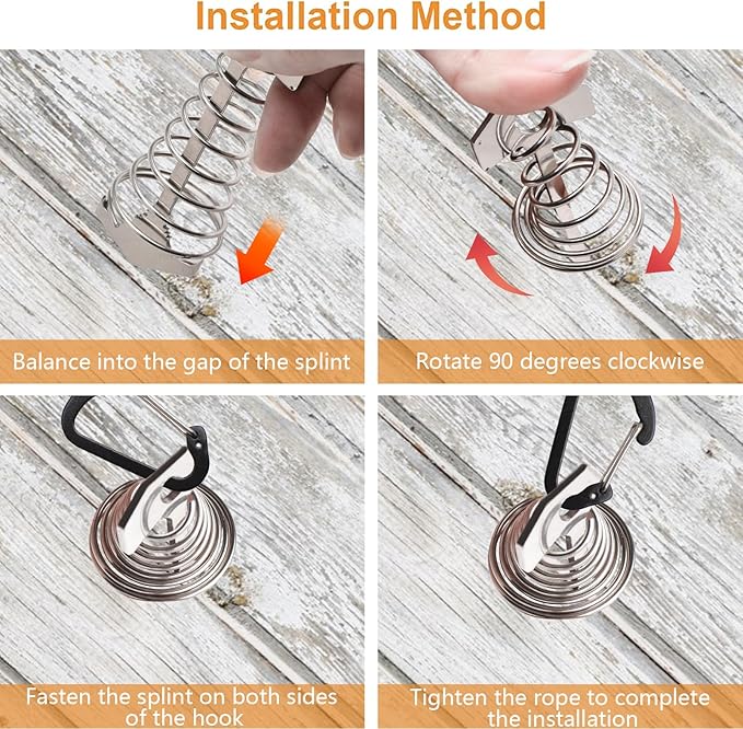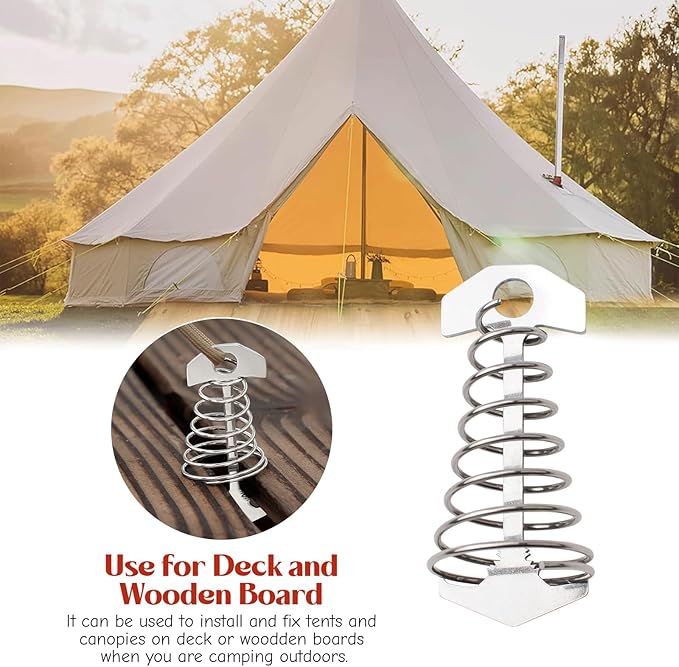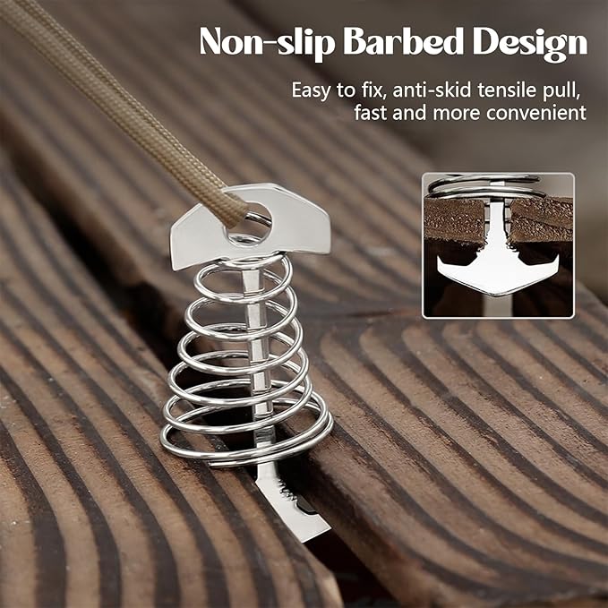 - π[Non-Slip & Adjustable Spring]: These deck nails are designed in the shape of fish bones, and the bottom double hook design creates stability better and prevents the nails from falling off or rotating due to the shaking of the tent. The telescopic spring shape can be adapted to decks of different thicknesses.β¨The burr design on the hook is more stable and firm.β¨