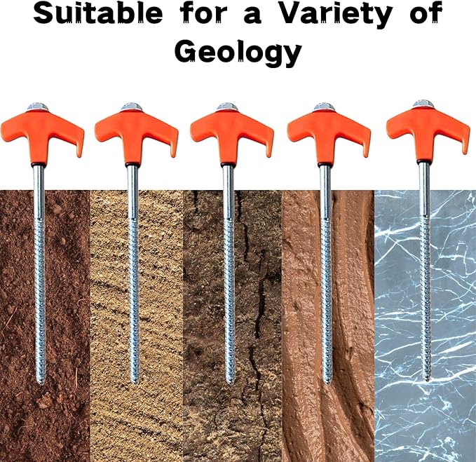 - 🏕️【Secure Installation】Our screw in tent stakes include 8 top-of-the-line camping tent ground pegs with hexagonal sockets. Made of durable steel with threaded ends for maximum grip on a variety of surfaces, preventing your tent or canopy from shifting or coming loose in windy conditions, providing stability and security for your outdoor shelter.
