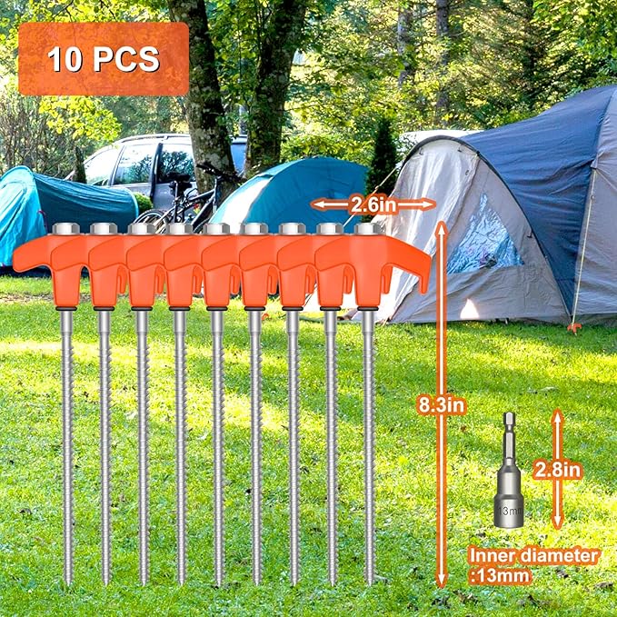 8" Screw Tent Stakes - Heavy-Duty Metal Threaded Camping Tent Spikes with Luminescent Plastic Heads, Essential for Outdoor Camping - 10 Pack