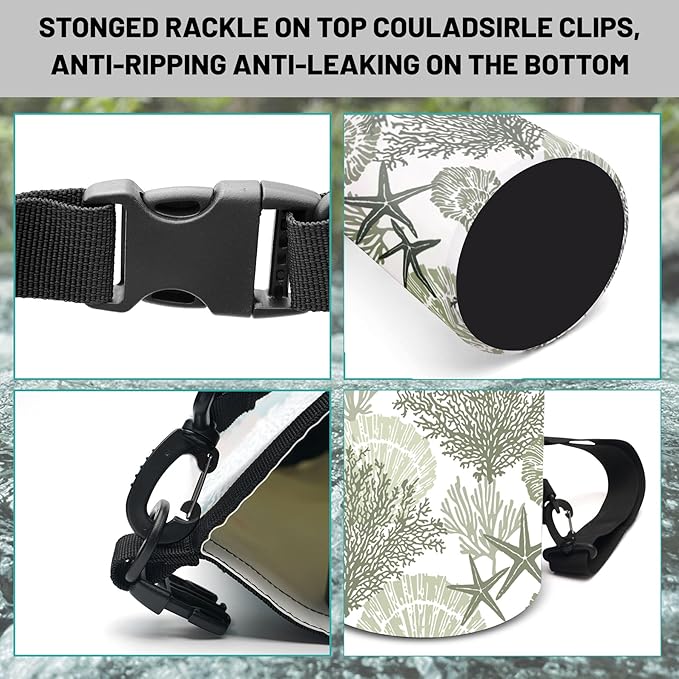 - Adjustable Carrying Options: Available in 5L and 10L with a removable shoulder strap for cross-body carry, or a 20L version featuring two adjustable straps for backpack-style comfort.Roll-top closure system provides secure watertight seal, keep your gear dry in any wet situation.Unique Seaside Conch Nautical Sage Green design dry bag backpack Carry it your way!