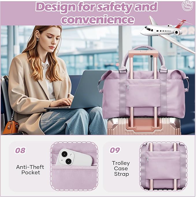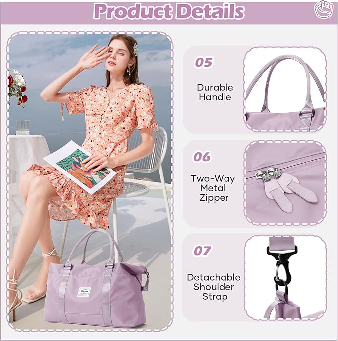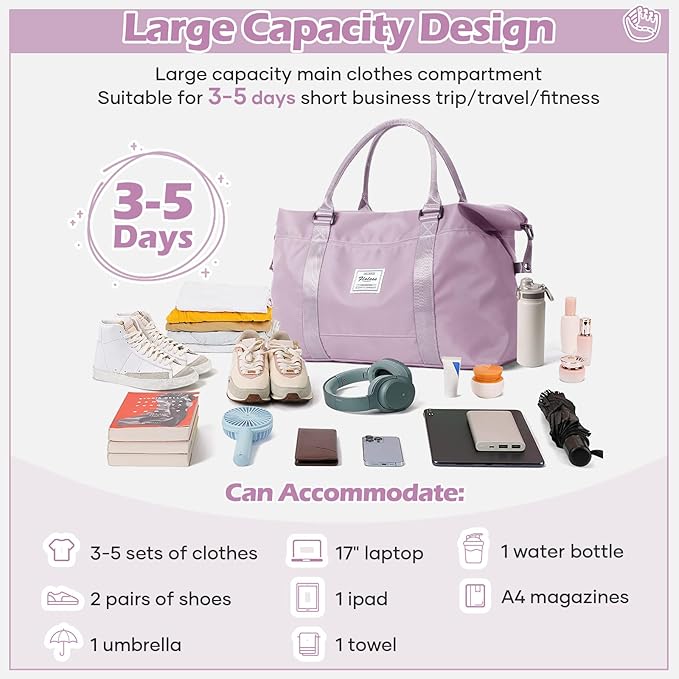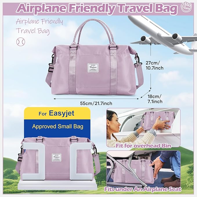 - 【Large and Multiple pockets Overnight bag】This overnight bag has six multiple internal and two external organizational pockets,which ensure you have a place for everything.The dimensions of the overnight bag for women are 10.63'*21.65'*7.09'.You can carry it onto an airplane. Large storage space for a clothes for short trip. It has a capacity of 30L and can hold 6 to 8 pieces of summer clothes,Cosmetics, toiletries, wallets, keys, earphones, mobile power, mobile phones, files.