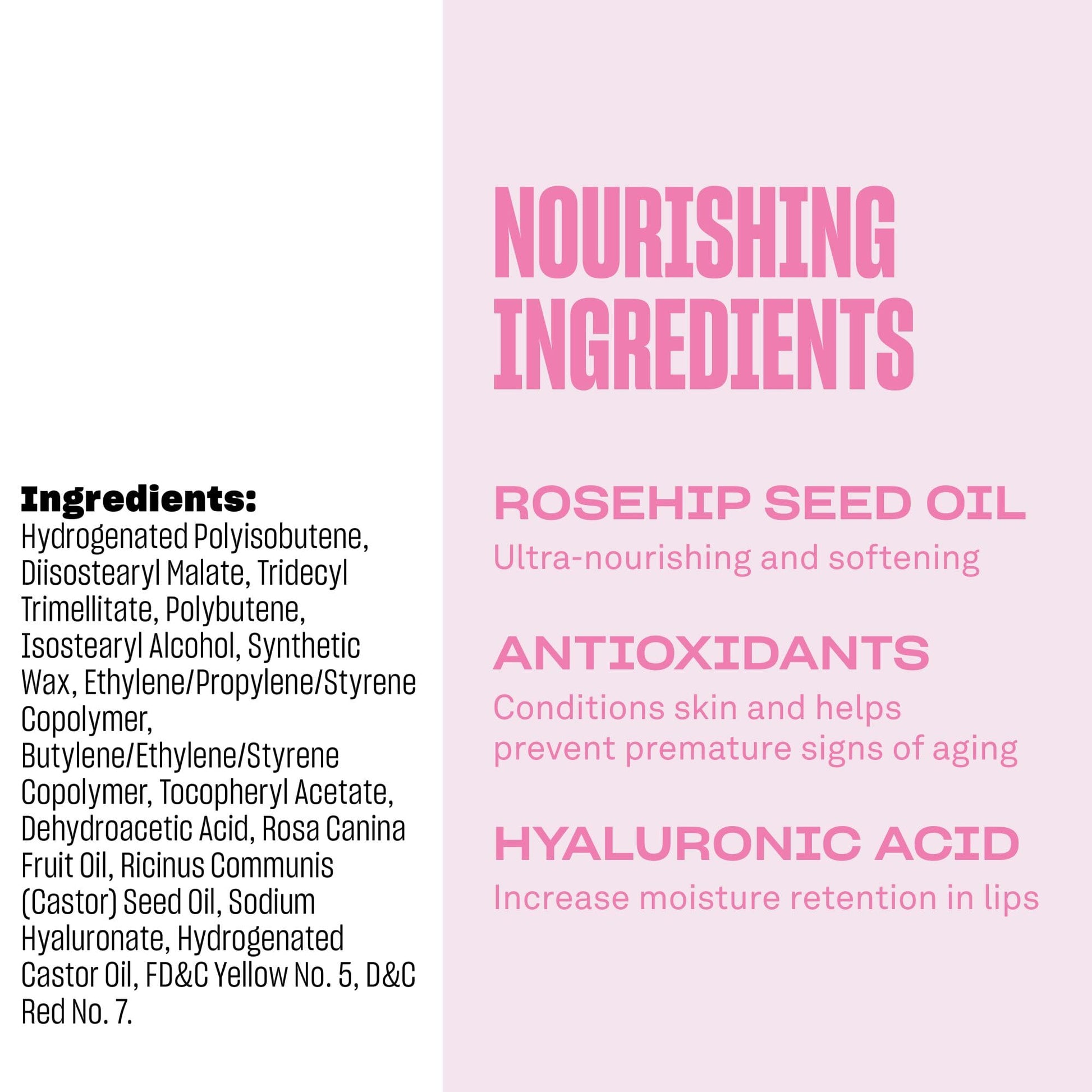 - Comfort lips with nourishing ingredients like hyaluronic acid and rosehip oil