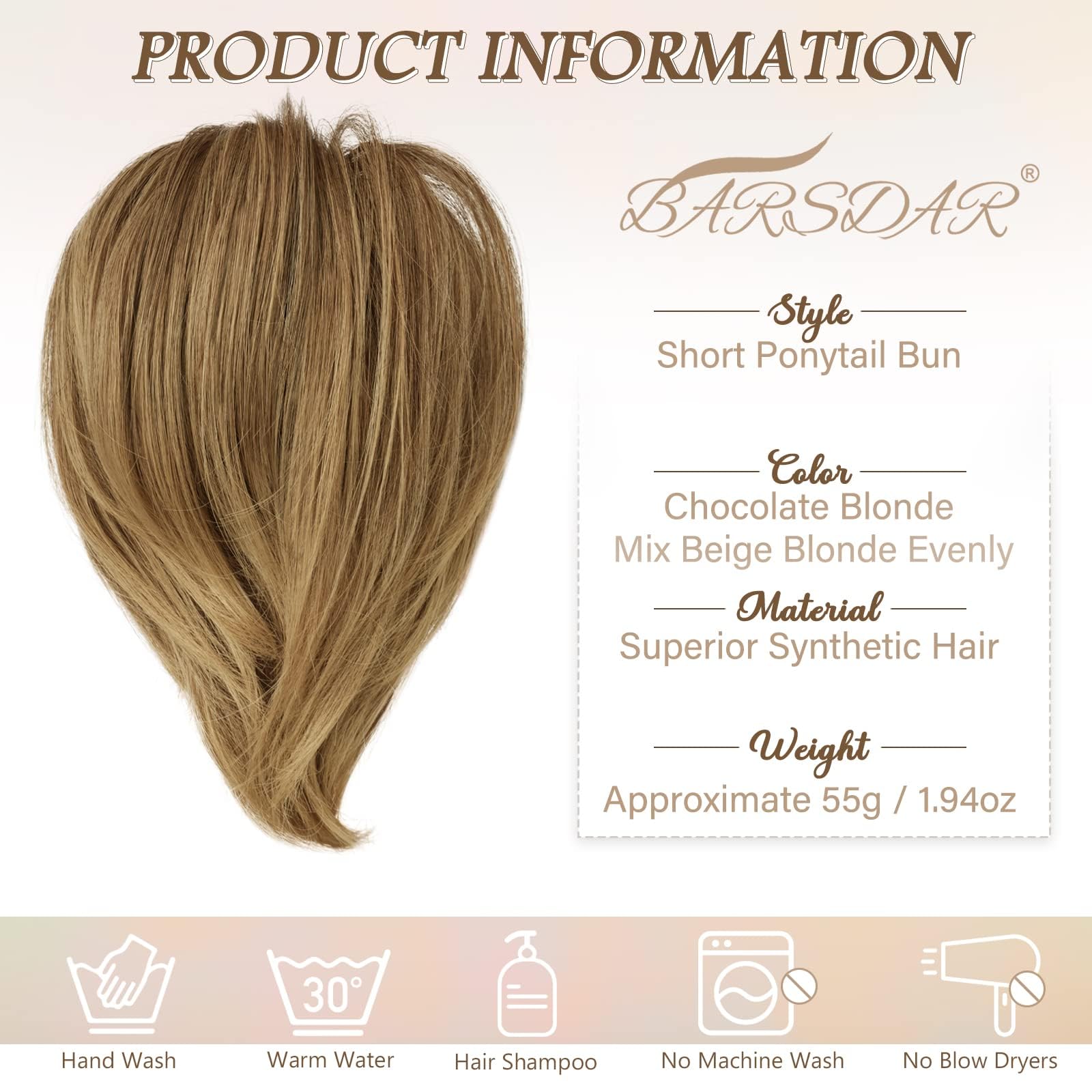 - 【Ideal Hair Bun Ponytail Extension】This gorgeous hair bun scrunchie by BARSDAR is an absolute must-have! It's a fun, innovative ready-to-wear hairpiece that's perfect for creating a casual and fresh look. The fluffy straight hair with slight curls at the end is absolutely gorgeous and ideal for rocking a stylish hair bun or a short ponytail.