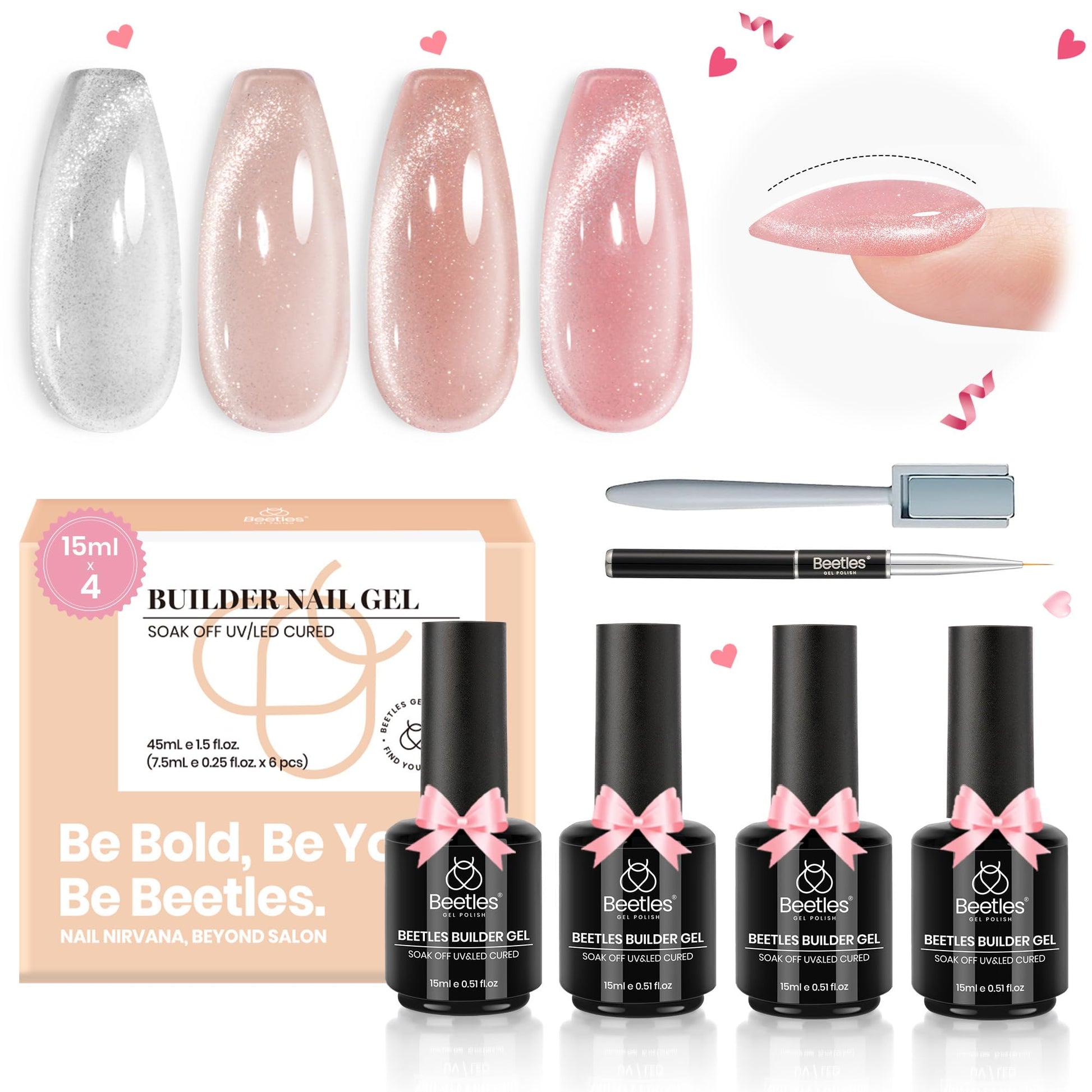 Beetles Builder Gel for Nails, 4 Colors 6 in 1 Strengthener Gel Builder for Nails, Cat Eye Gel Glitter Pink Nude Hard Gel Apex Nail Thickening Extension Soak Off Uv Valentines Gift for Women