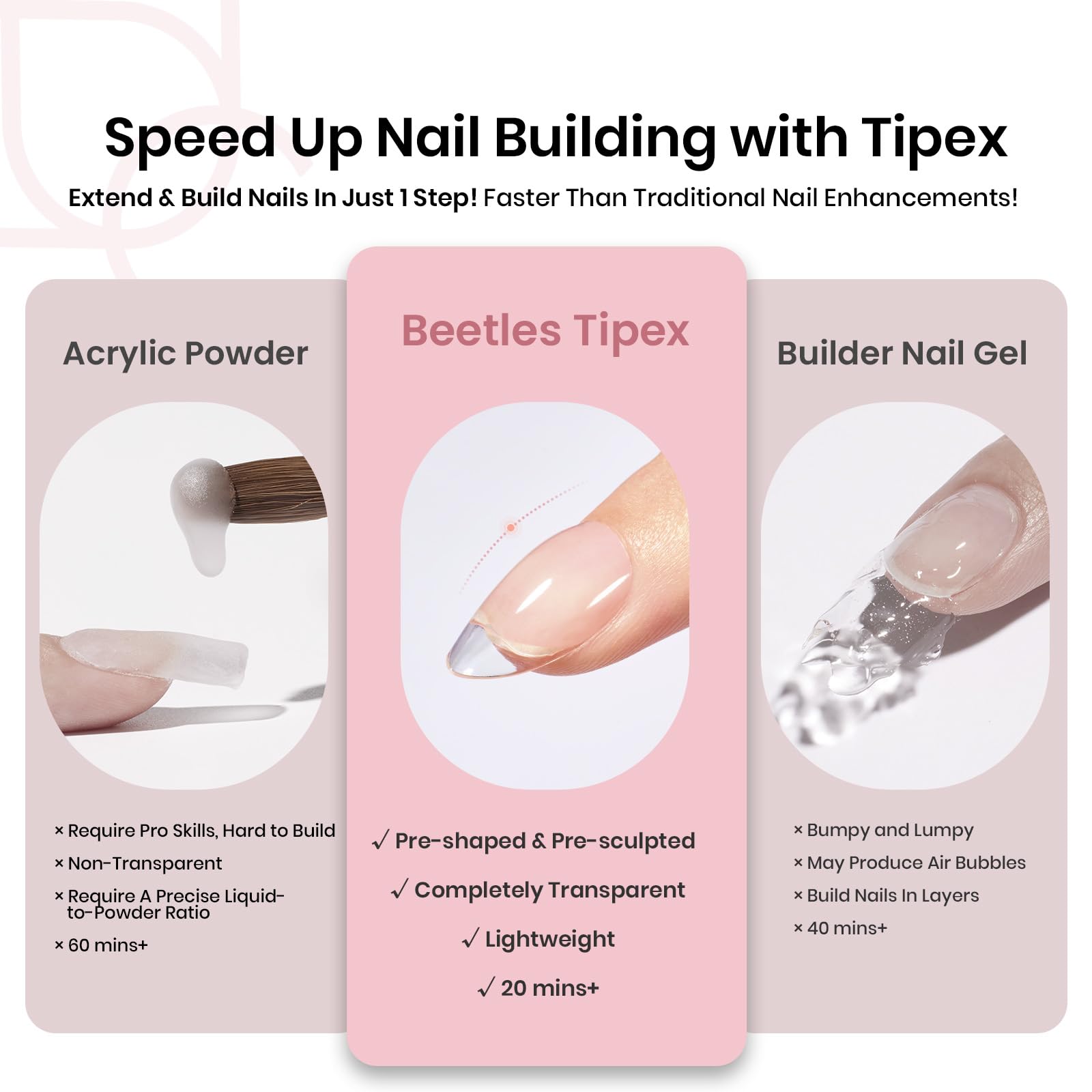 - Beetles Tipex Nail Tips Upgraded: Tired of wasting time on nail prep? Tipex pre-sculpted, pre-etched & pre-shaped acrylic nail tips are here to rescue you! Beetles Tipex Instant Apex Nail Tips come with a ready-made instant apex and c-curve, eliminating the tedious tasks of layering, filing, and shaping. Get ready to speed up your mani process with nail drill and save valuable time! Designed specifically for flat nails.