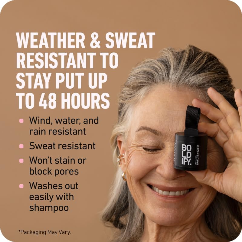 - Instant Coverage, 48-Hour Guarantee - Locks on Until You Shampoo: Hair loss? Skip the embarrassing all-day touch-ups. BOLDIFY is the ultimate hair shadow powder - locking tightly to your follicles and covering your scalp, without clogging pores, for that full-bodied, knock-out look that stays put until your next shampoo. Use by itself or combine with BOLDIFY Hair Fibers for thinning hair for next-level coverage. Works great for grey coverage, rootline touchups, and brightening highlights, too!