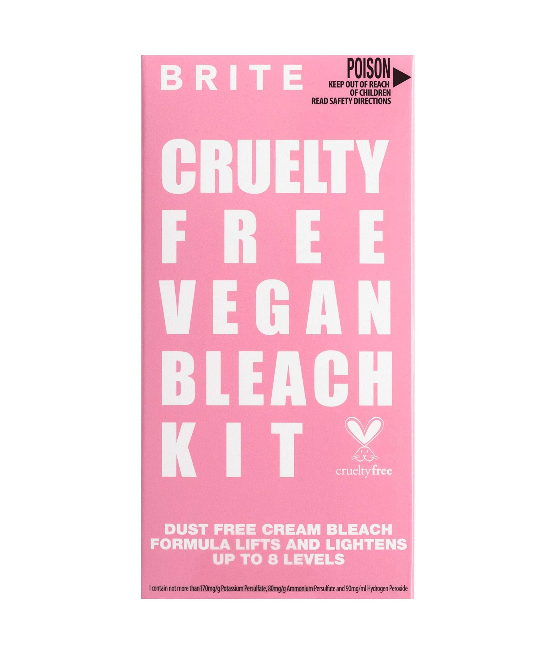 Details: ABOUT THE PRODUCT - The BRITE Vegan Bleach Kit is your go-to dust-free, ammonia-free kit for bleaching that can lift and lighten your hair by up to 8 levels. This low odor, high performance lightener is gentle and suitable for all hair types. Each kit contains Developing Cream (2.7 Fl Oz), Lightening Cream (1.69 Fl Oz), Hair Mask (1.69 Fl Oz), and one pair of gloves. WHY YOU NEED IT - BRITE's Vegan Bleach Kit allows you to create streaks, highlights, and de-coloration while acting gently on the hair's natural pigments and structure. Formulated with protective and emollient substances that nourish and protect hair during even the most intense lightening processes PETA certified, vegan, and cruelty-free. HOW TO USE - Read all safety directions and instructions. Do sensitivity test and strand test before use. Mix lightening cream and developing cream in a plastic bowl. Apply to sections of clean, dry hair using a tint brush. Allow to develop for 30 minutes. The lightest hair color should be pale yellow prior to rinsing. Do not leave on for longer than 45 minutes. Rinse thoroughly. Shampoo twice. Apply included hair mask to towel dried hair. Leave on 10-15 minutes. Rinse clean. CAREFULLY FORMULATED - BRITE Bleach Kits are low-odor, dust-free, ammonia-free, and can gently lift and lighten hair by up to 8 levels. Each kit contains everything you need to transform your hair at home, including a nourishing, anti-breakage hair mask to give your tresses some extra love post-treatment. ABOUT THE BRAND - BRITE is a sustainable brand focused on ethical and healthy hair care for those that like to be creative, have fun and love our world. Our ammonia-free formulas allow you to achieve and maintain gorgeous head-turning hair colors at home. We care about the environment and take care in our manufacturing processes to minimise our environmental impact. We never on test our products on animals, we are PETA certified, and all of our products are vegan.