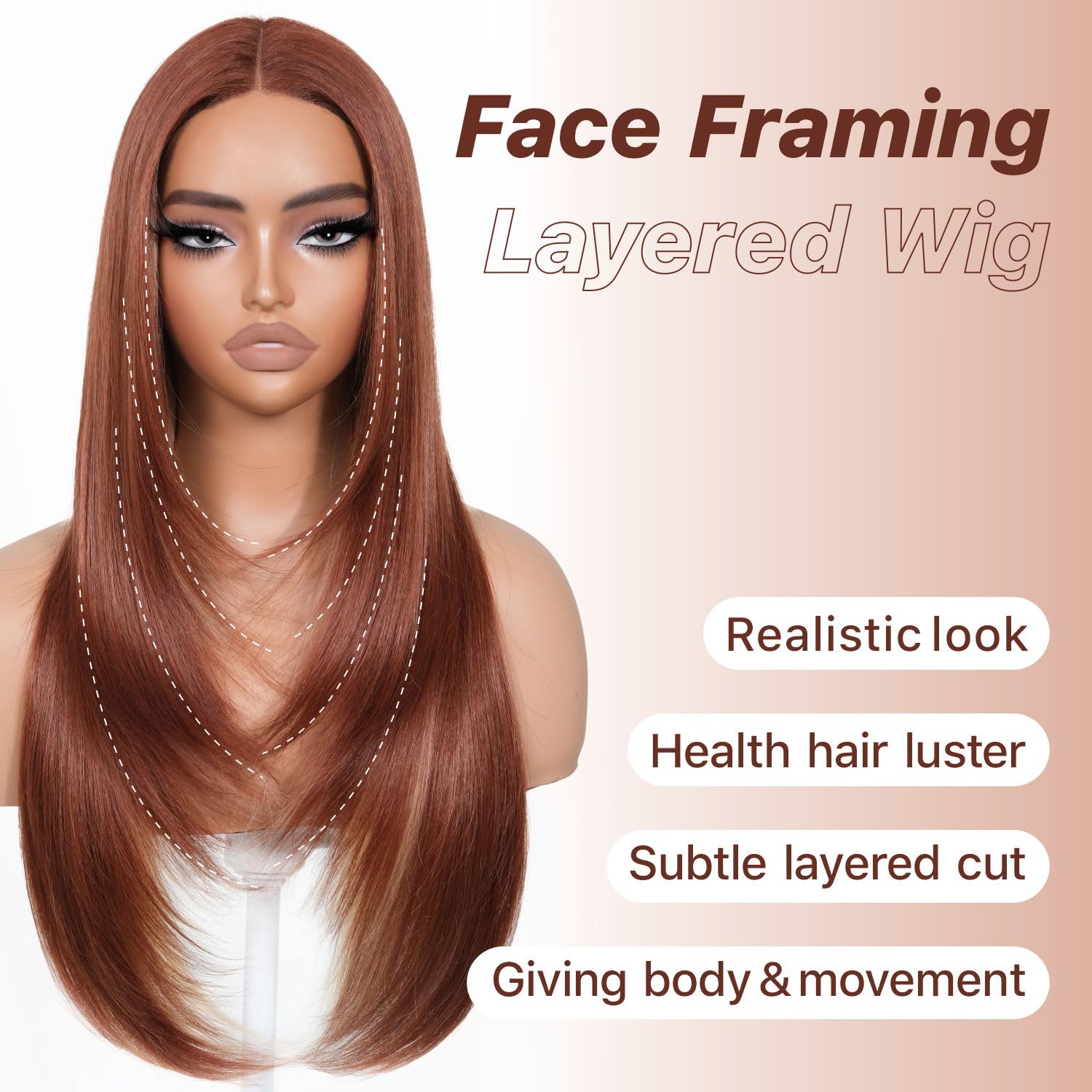 BrownBomb Cooper Blond Wear and Go Glueless Wigs Pre Plucked Pre Cut for Beginners Synthetic Lace Front Wigs For Woman With Bangs Long layered Straight 26 Inch Ginger Highlights 3 Seconds to Wear