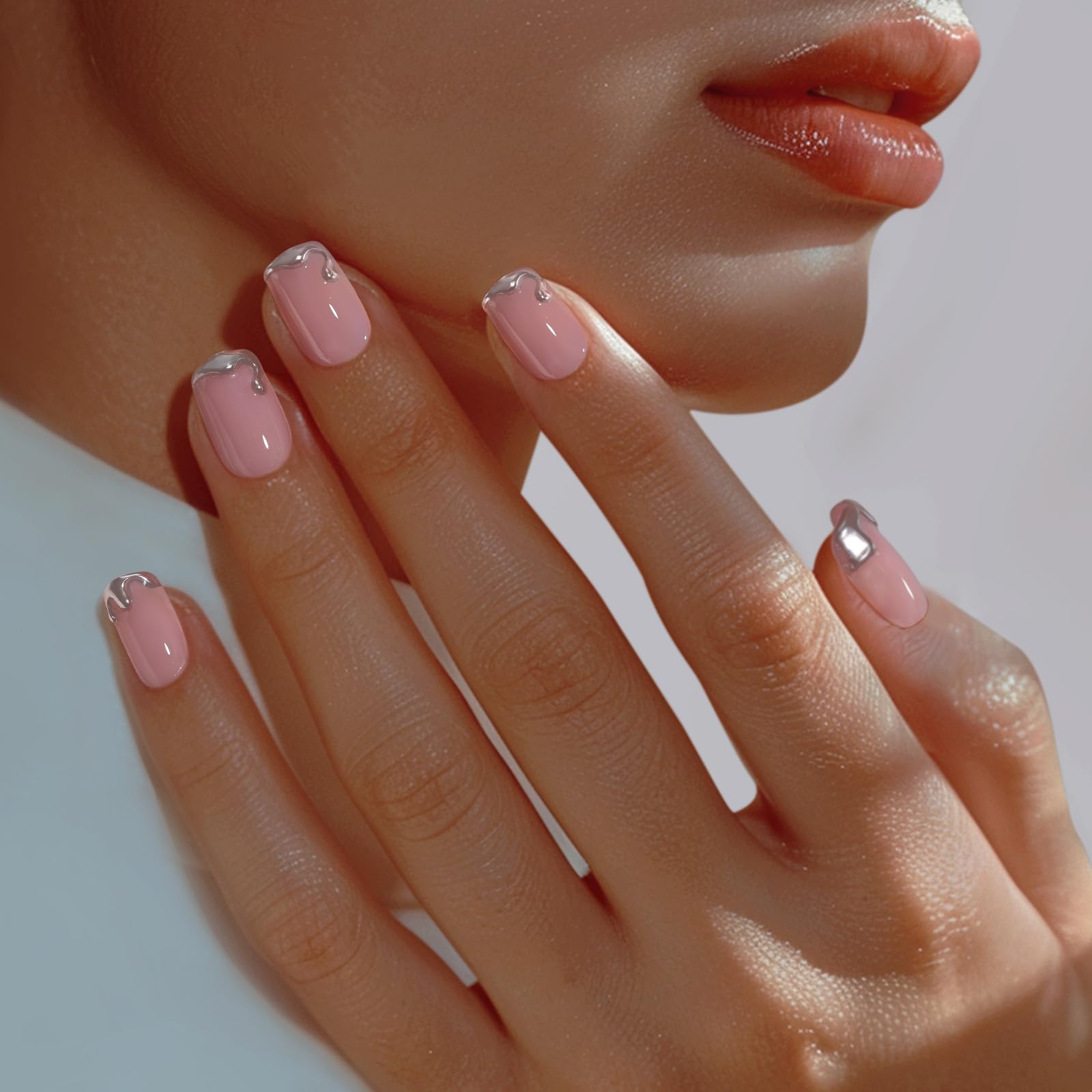 BTArtbox Press On Nails Short Square - Sliver Designed Press On Nails, 3D Sliver Foil Glue On Nails for Women Gifts, Natural Fake Nail with Glue, Glue On Nails in 15 Sizes, Snow Queen