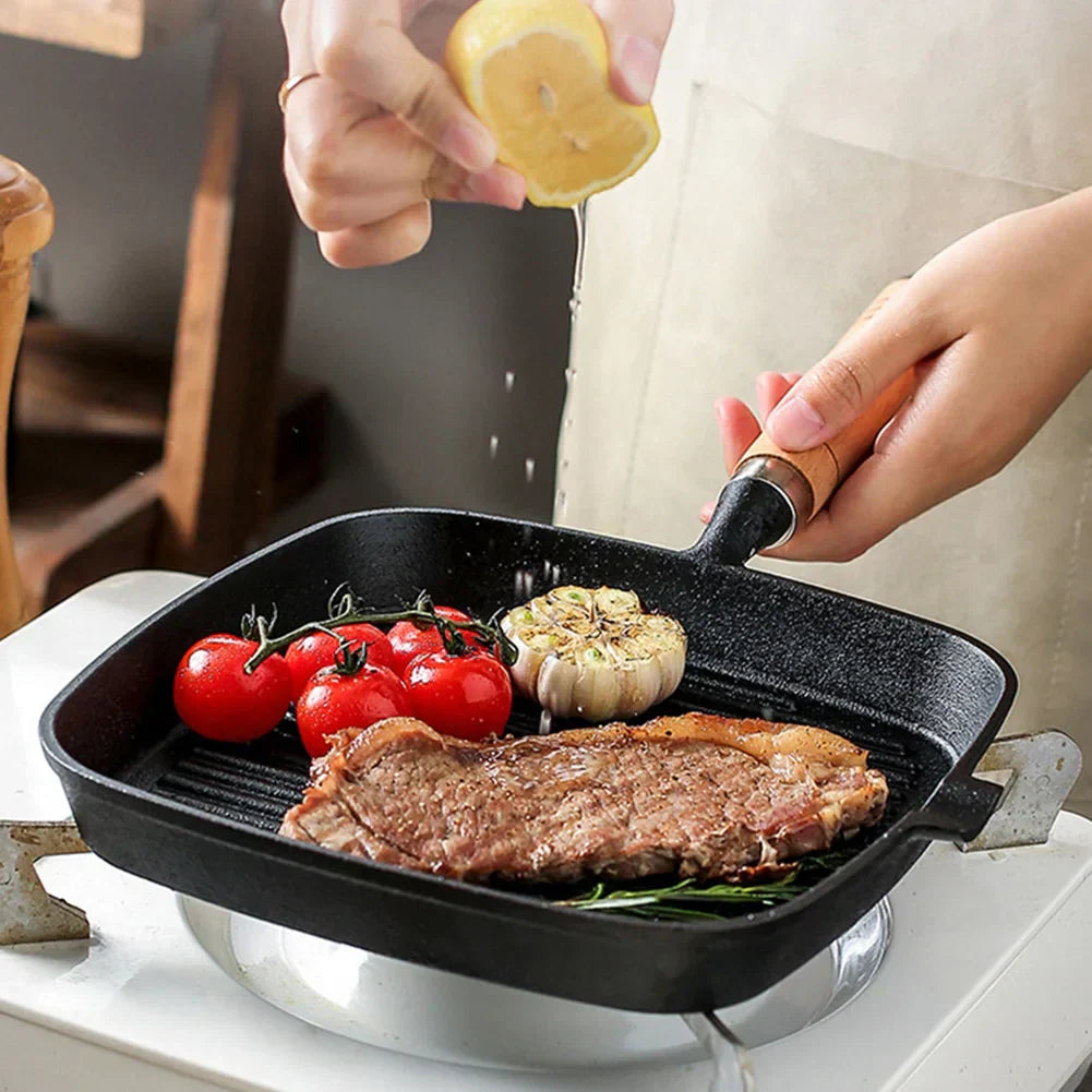 Crafted from durable cast iron, this square grill pan delivers superior heat retention and even cooking, ideal for searing meats and vegetables to perfection. Its ridged surface creates authentic grill marks while allowing excess fat to drain away, promoting healthier meals. Designed for versatility, it works seamlessly on stovetops, ovens, and grills, making it an essential tool for any serious cook seeking professional results at home.