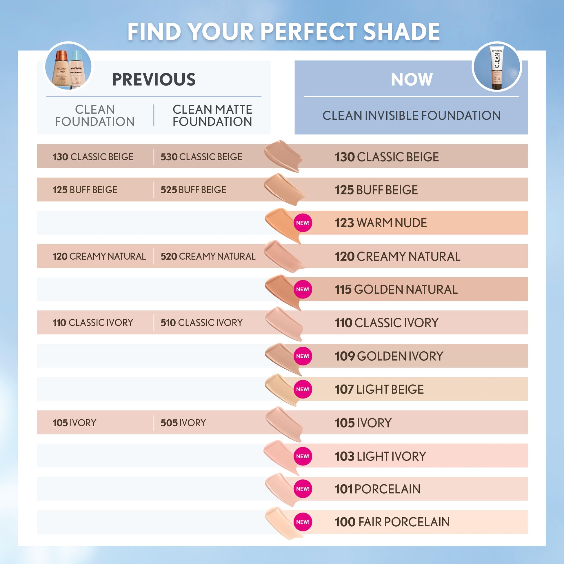Details: New & improved Clean Invisible Foundation is now clean & fragrance free. Lightweight, breathable formula looks & feels like your skin, but better. Now in an easy to use tube.