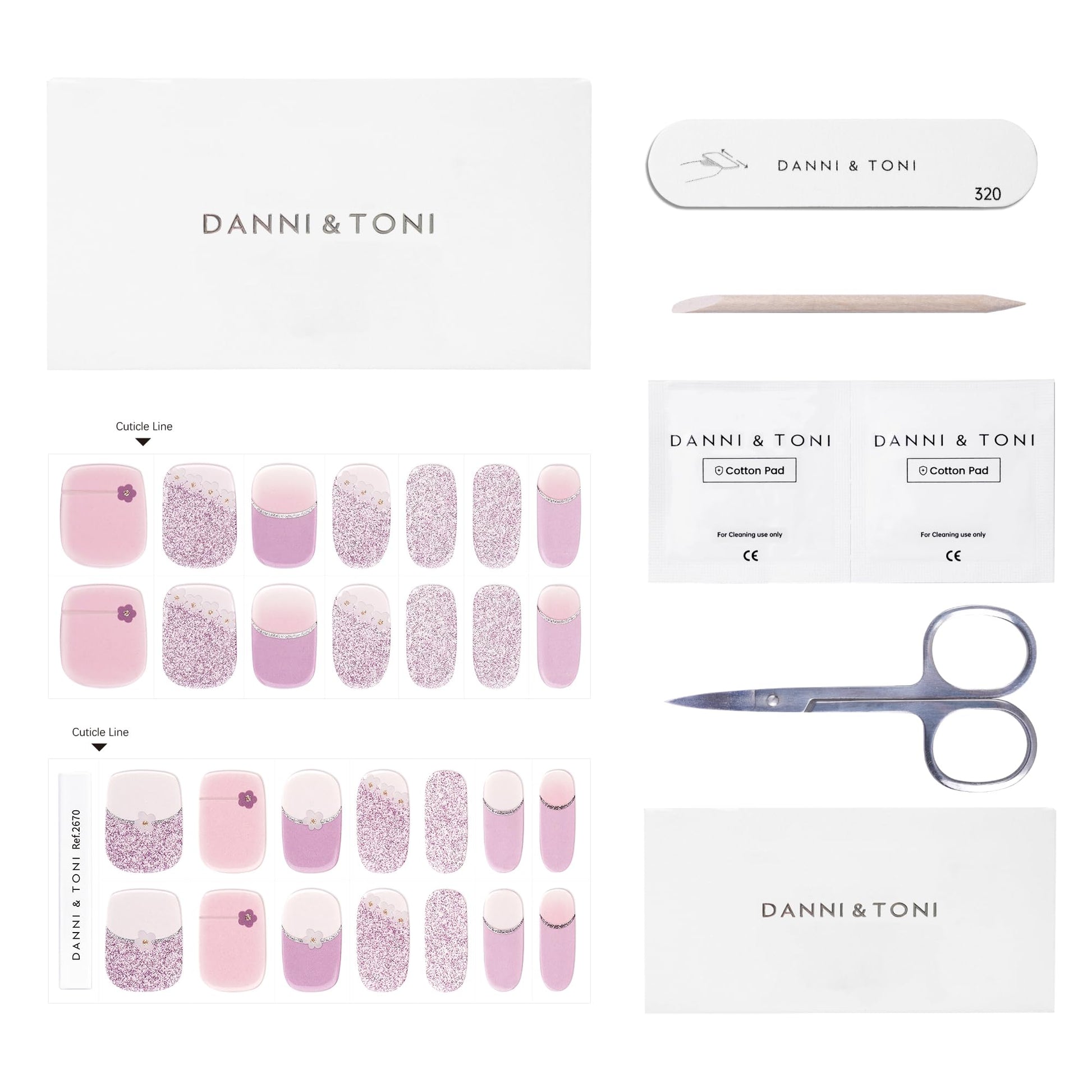 DANNI & TONI Semi Cured Gel Nail Strips Purple (Spring Whisper) French Tip Flowers Gel Nail Wraps UV Nails 28 Stickers