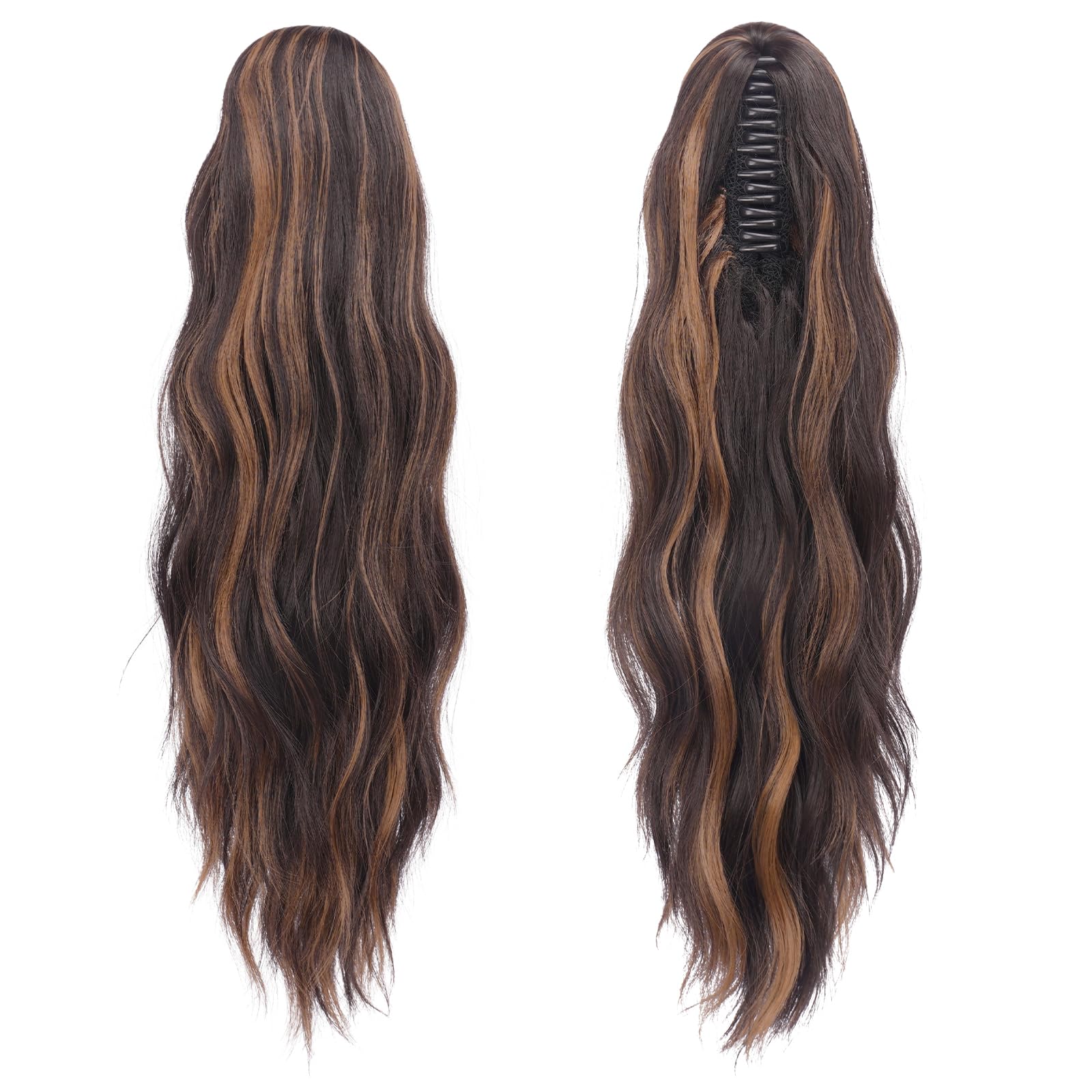 FESHFEN Ponytail Extensions, 20 inch Long Claw Clip in Ponytail Hairpiece Synthetic Pony Tails Hair Piece Natural Wavy Hairpieces for Women, Dark Brown & Caramel Blonde