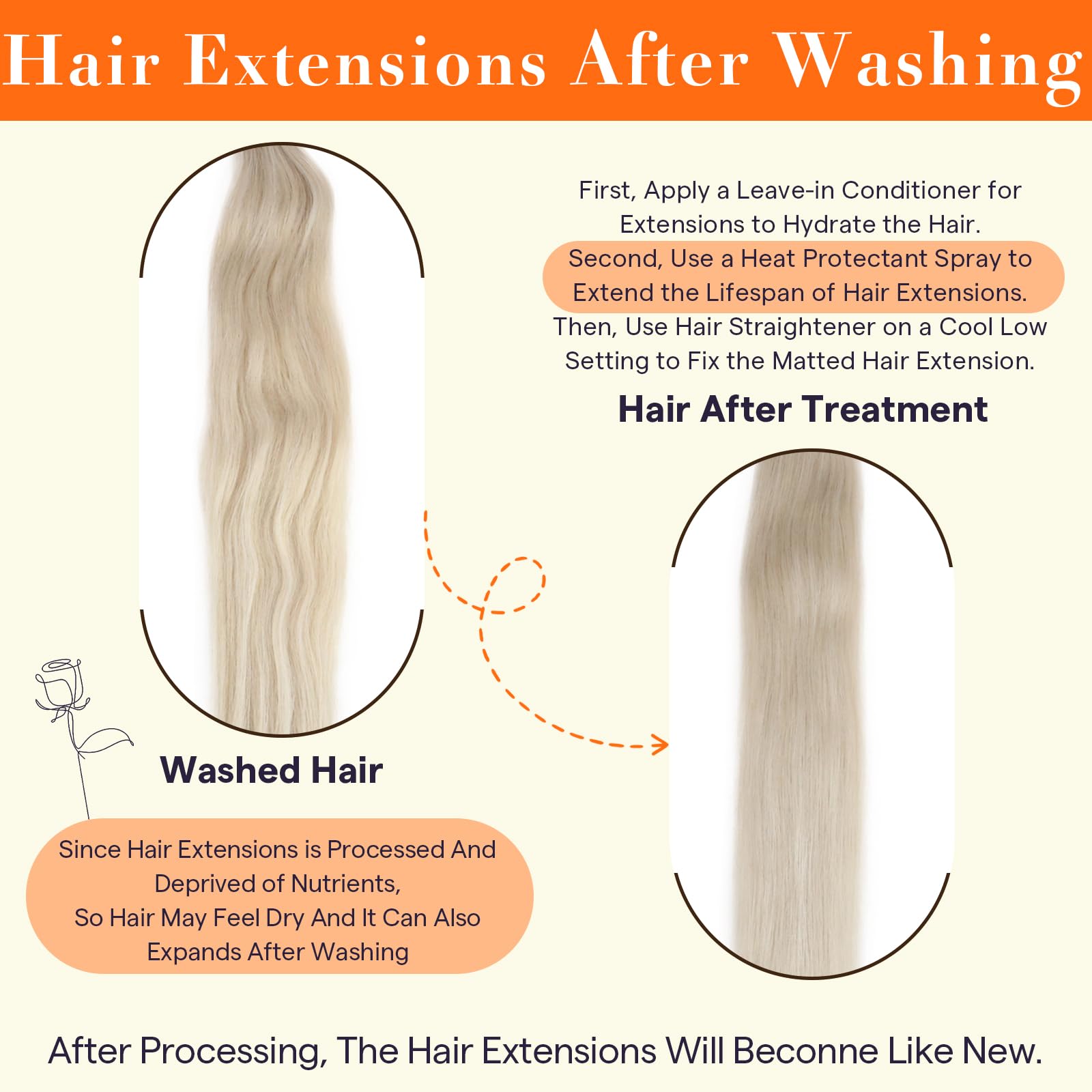 - Care Tips and Increase life of hair weft:We recommend wash hair weft,use a mild shampoo and conditioner,wash with warm water, air drying;Once you have put on the hair extensions, comb hair and tie it up into a loose ponytail before sleeping